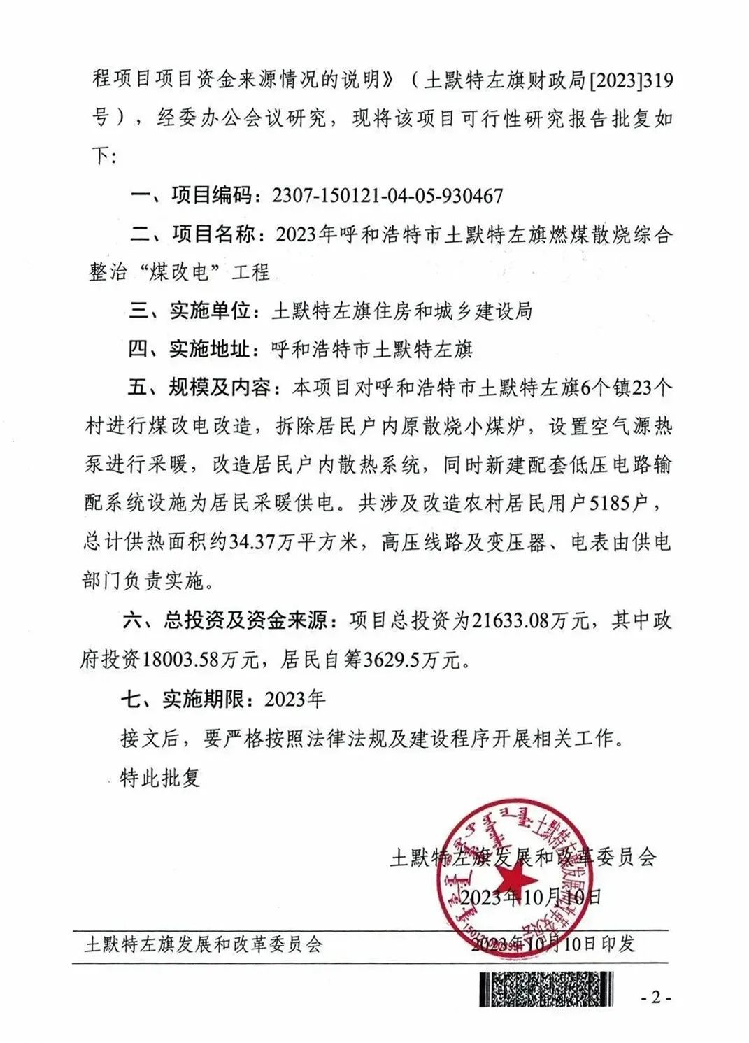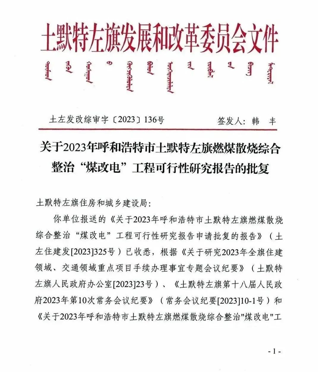 关于2023年呼和浩特市土默特左旗燃煤烧综合整治“煤改电”工程可行性研究报告批复。
